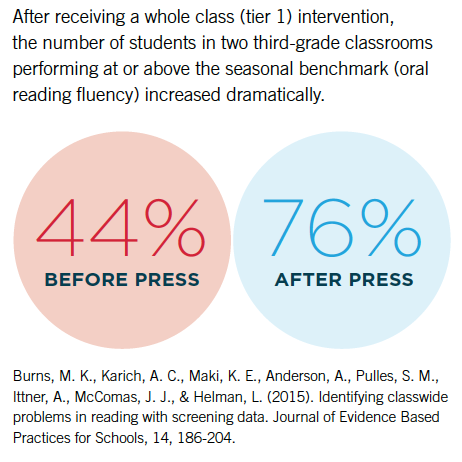 PRESS classwide interventions can be a powerful tool to use at the Tier 1 level by providing targeted instruction delivered by the classroom teacher before considering allocating resources to Tier 2 interventions. A classwide intervention is a practice that can be employed when more than half a classroom’s students are performing below the universal screening benchmark (VanDerHeyden & Burns, 2010). A classwide intervention is selected using screening data to target a specific area of reading and is administered through whole-group instruction for 10-12 consecutive days. Following the classwide intervention, an additional screening measure is administered to all students. Students who remain below the benchmark criterion will be identified as needing Tier 2 support. Several studies have demonstrated the potential effectiveness for implementing classwide interventions in the elementary setting (VanDerHeyden & Burns, 2005; Burns, et al., 2015).